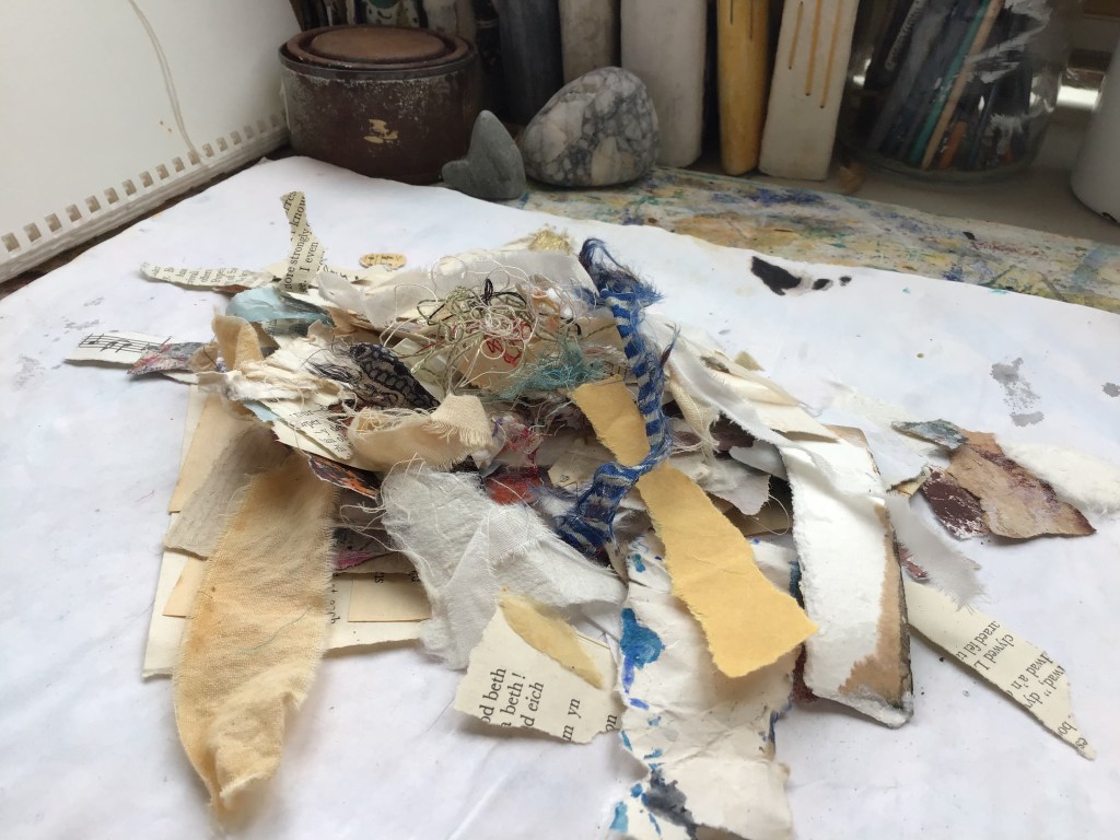 My beginning is always the same. Fragments. Every journal page and piece of art that I make begins with a gathering of fragments- paper, cardboard, fabric, thread and other ephemera – a gathering of bits of life.