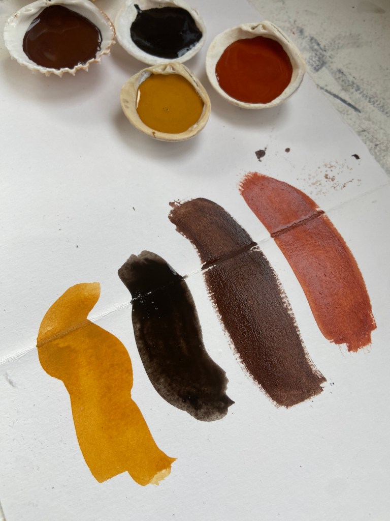 I grind chalk into a thick gritty paint and mix some pigments, Yellow Ochre, Red Ochre, Burnt Umber, Cassell Brown Earth, and open a journal. Using these pigments feels elemental. Painting with the earth is like walking in nature, along shoreline and woodland track, wandering the edges, gathering and noticing. Noticing the devastating beauty, the perfect imperfection. Contrast and duality.
