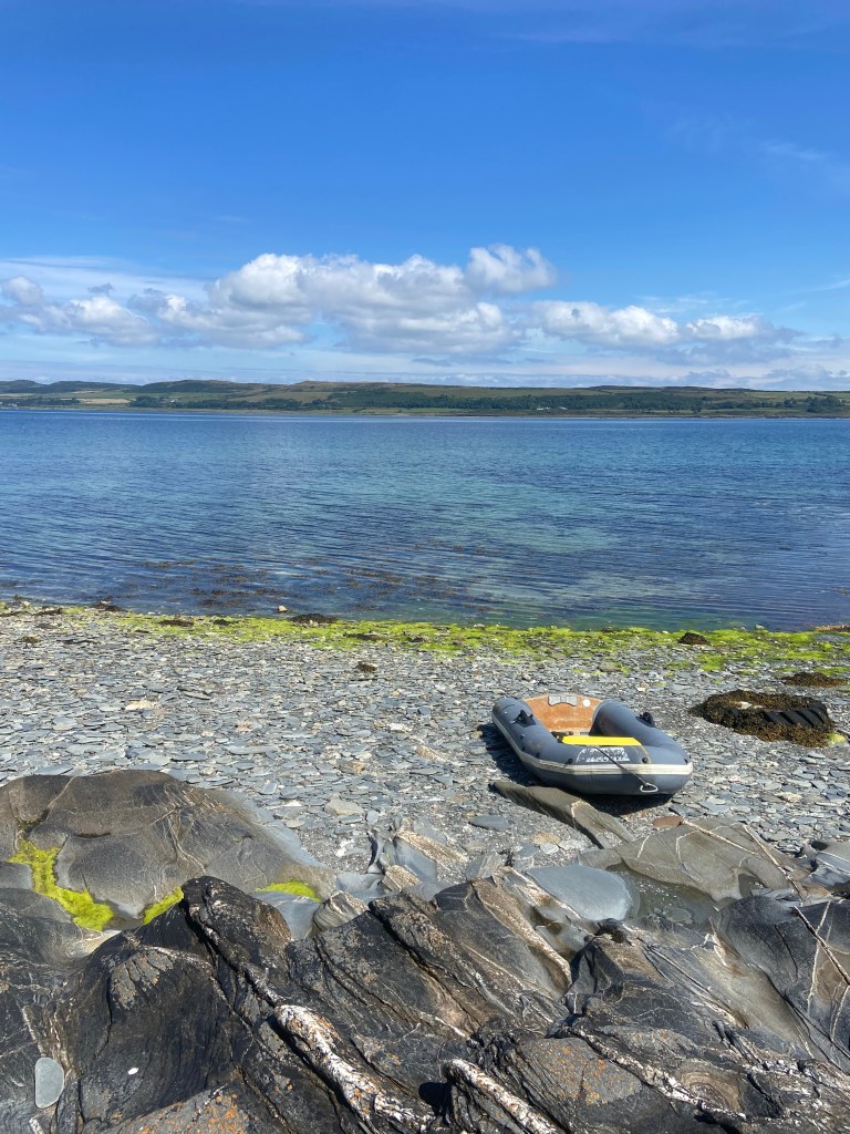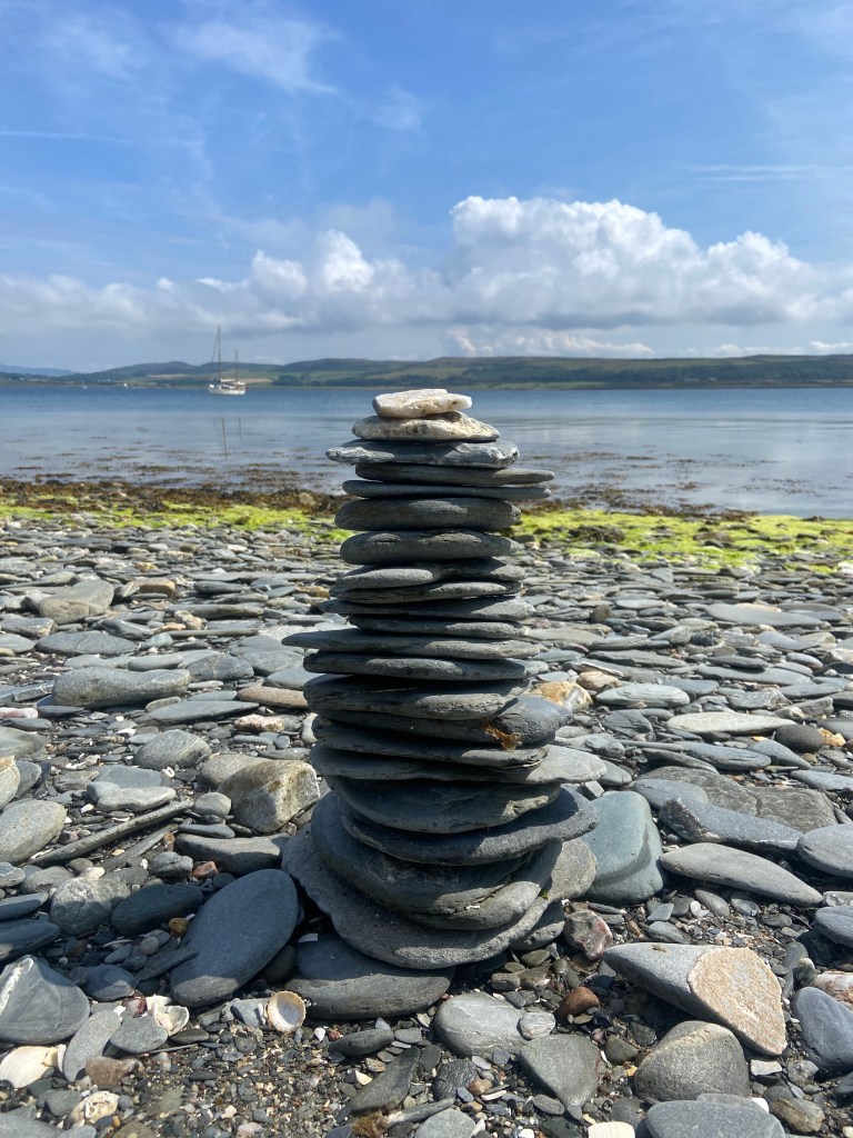 15 July Slowly the smooth flat stones are placed one on top of each other until a cairn is formed. When the final stone is laid I make a wish. It is still and calm. It’s a rare warm day, the sky bright and blue and the sea like glass. After sailing through the Kyles of Bute we are now anchored off the small island of Inchmarnock and once we are sure the anchor is set and we’re happy that the boat is secure we row ashore to wander and gather. The water is clear and cold as we step into it and haul the dinghy up onto the stony beach.