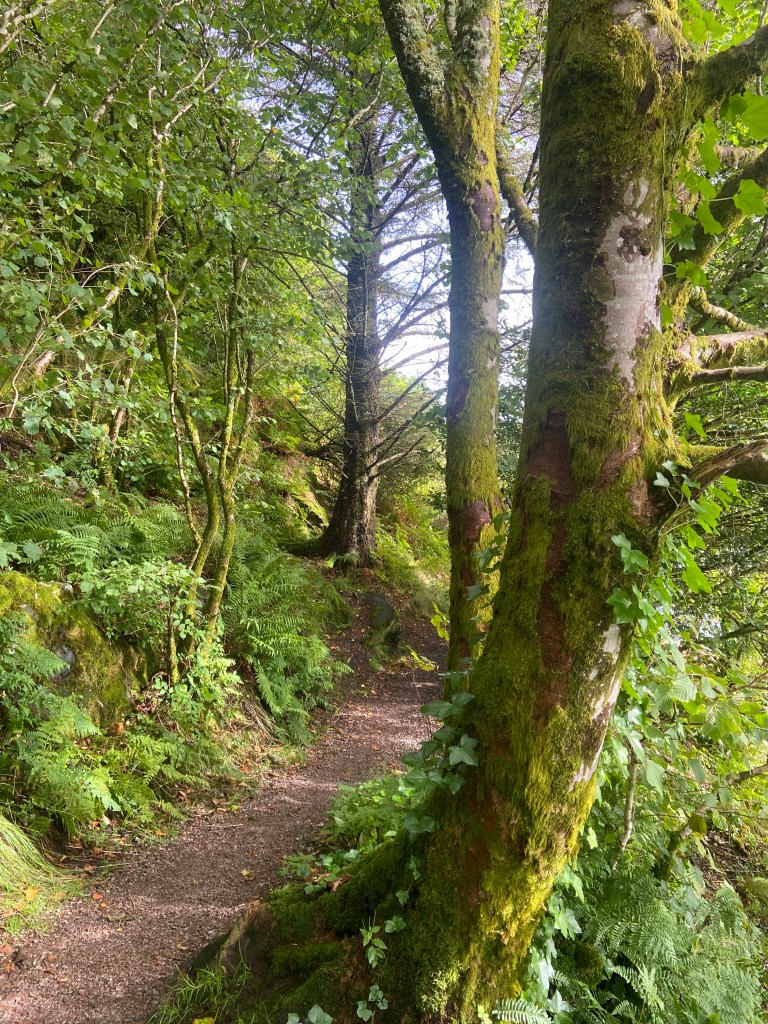 20 August The sky is a palette of greys shot through with the occasional streak of blue. Heavy rain is alternating with bursts of bright sunshine and the wind is whipping up white horses in the loch. A walk through the woods offers some shelter. The green is vivid but the trees are starting to show signs of autumn and blackberries are ripening. This woodland path opens out onto a stony beach and again I think of Tove and her love of the wild. She knew that was where the magic lived, where “the clocks stopped quite a while ago and it’s a long time since you wore shoes”.